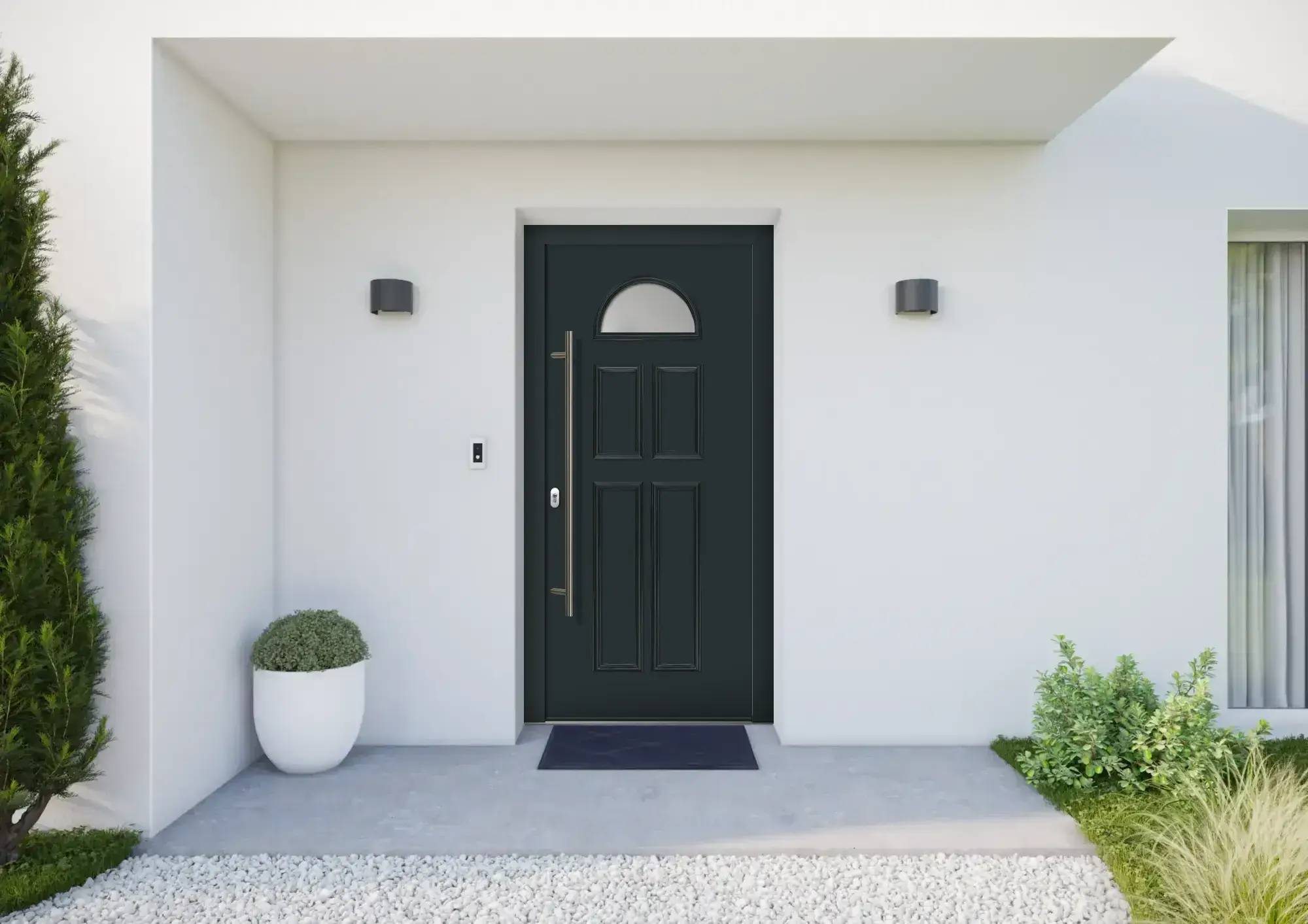 Porte d'entrée moderne blanche avec cinq fenêtres rectangulaires et une plante verte en pot à proximité.