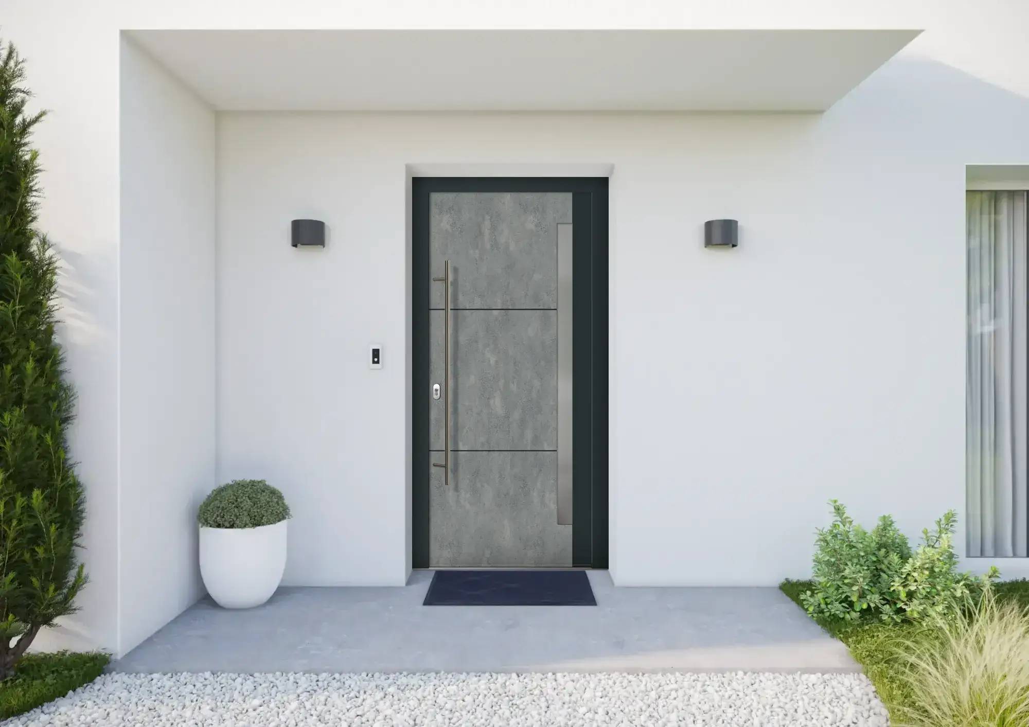 Porte d'entrée moderne blanche avec cinq fenêtres rectangulaires et une plante verte en pot à proximité.