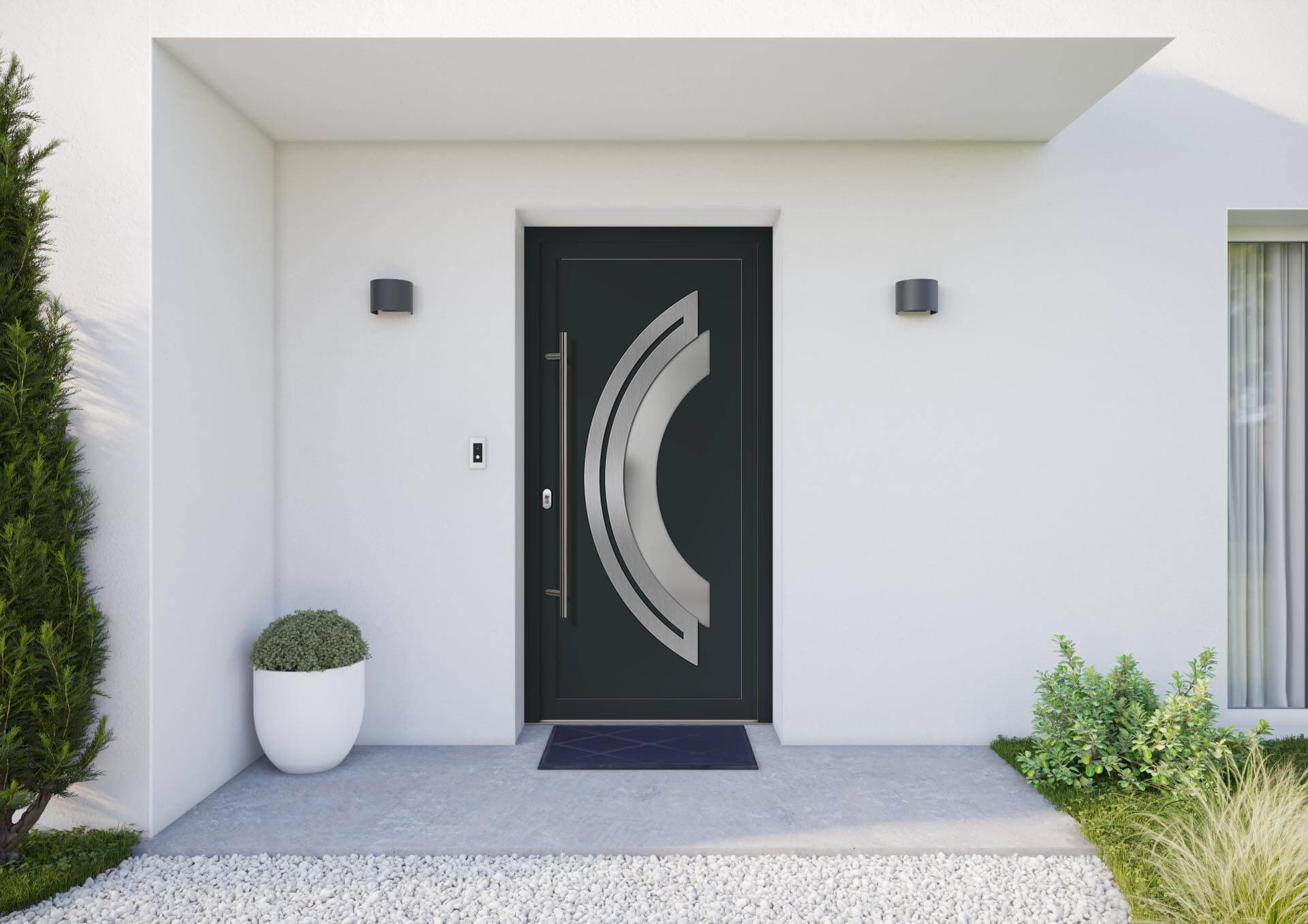 Porte d'entrée moderne gris foncé avec une poignée argentée et trois bandes horizontales en métal.