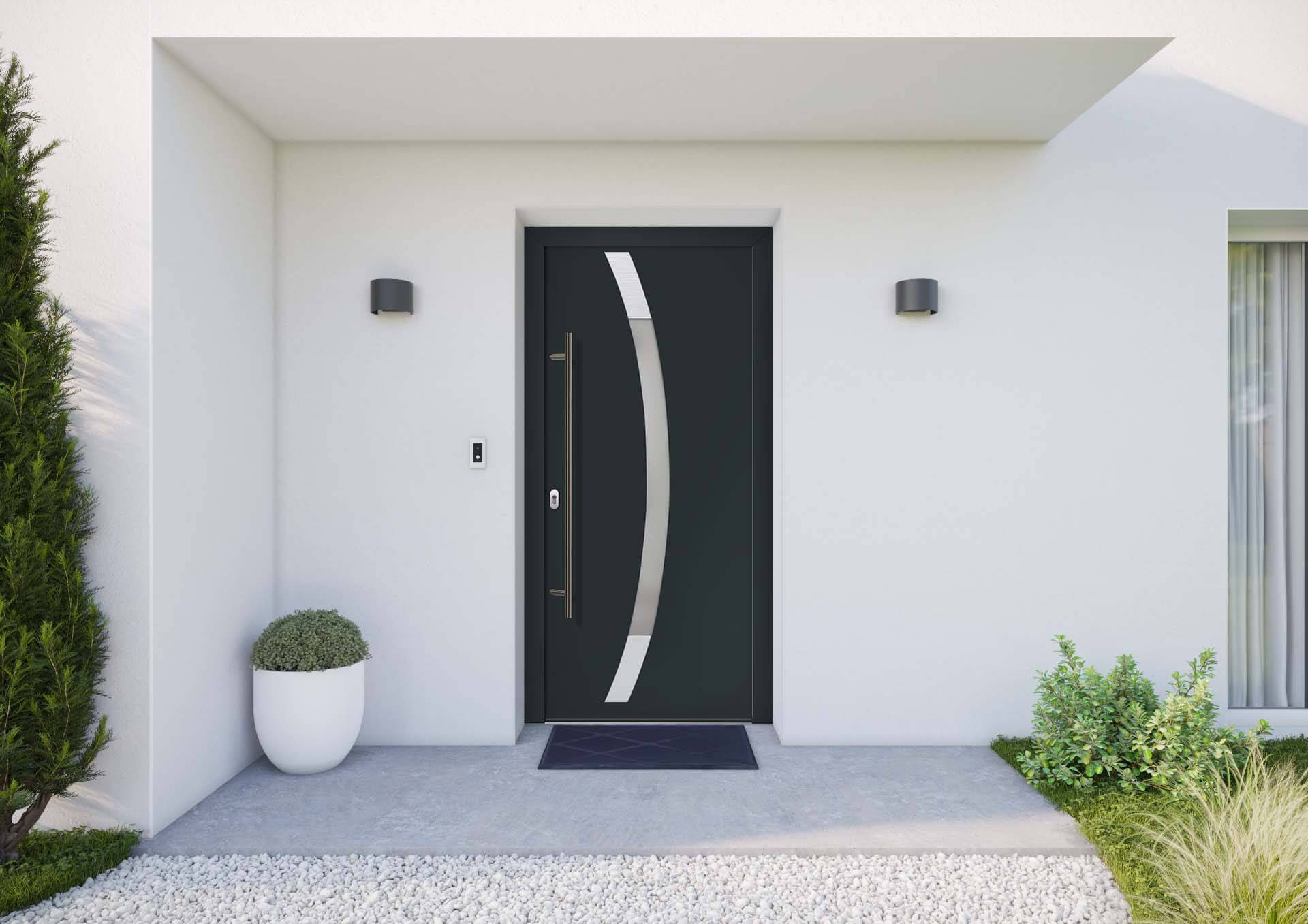 Porte d'entrée moderne gris foncé avec une poignée argentée et trois bandes horizontales en métal.