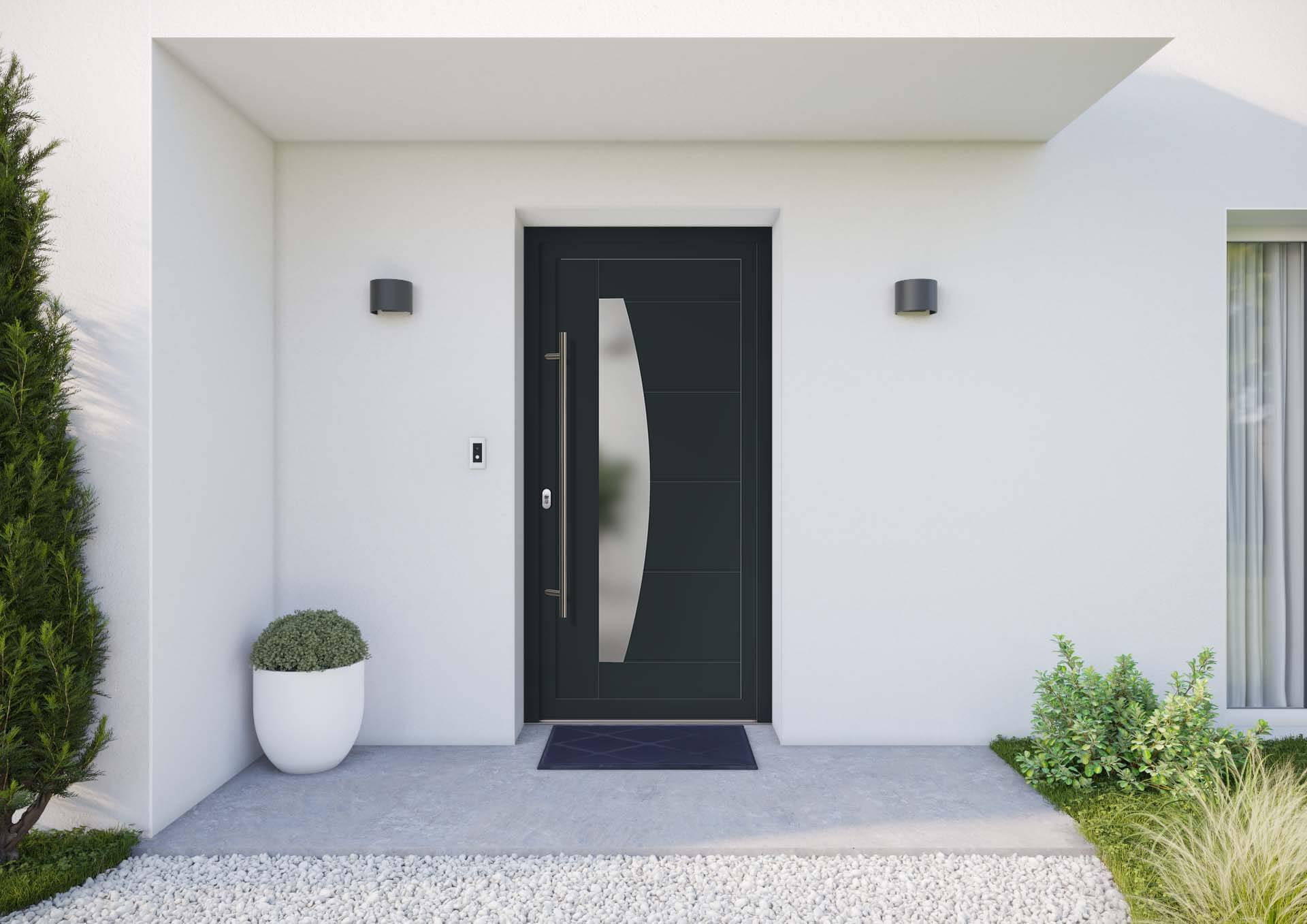 Porte d'entrée moderne blanche avec cinq fenêtres rectangulaires et une plante verte en pot à proximité.