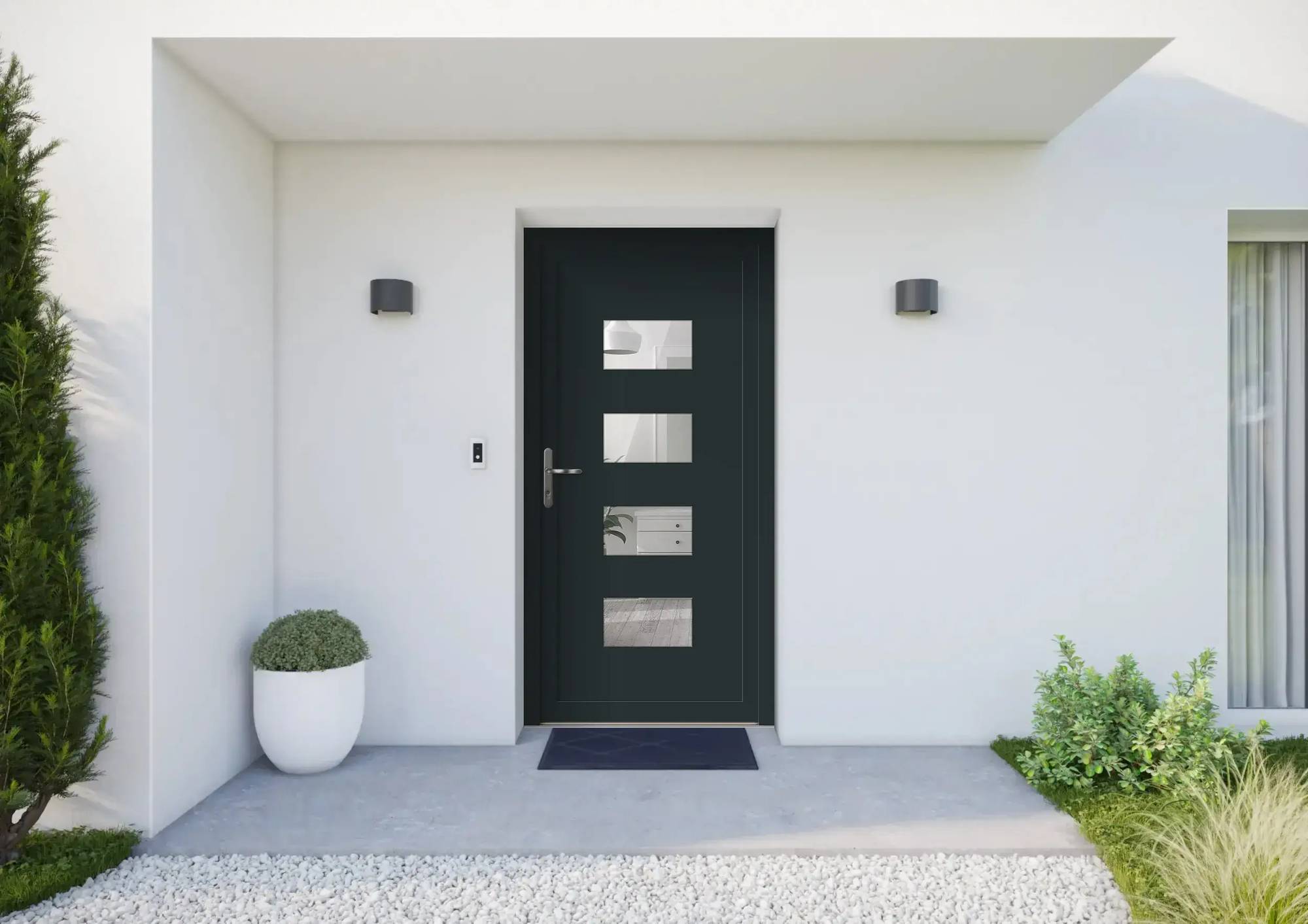 Porte d'entrée moderne blanche avec cinq fenêtres rectangulaires et une plante verte en pot à proximité.