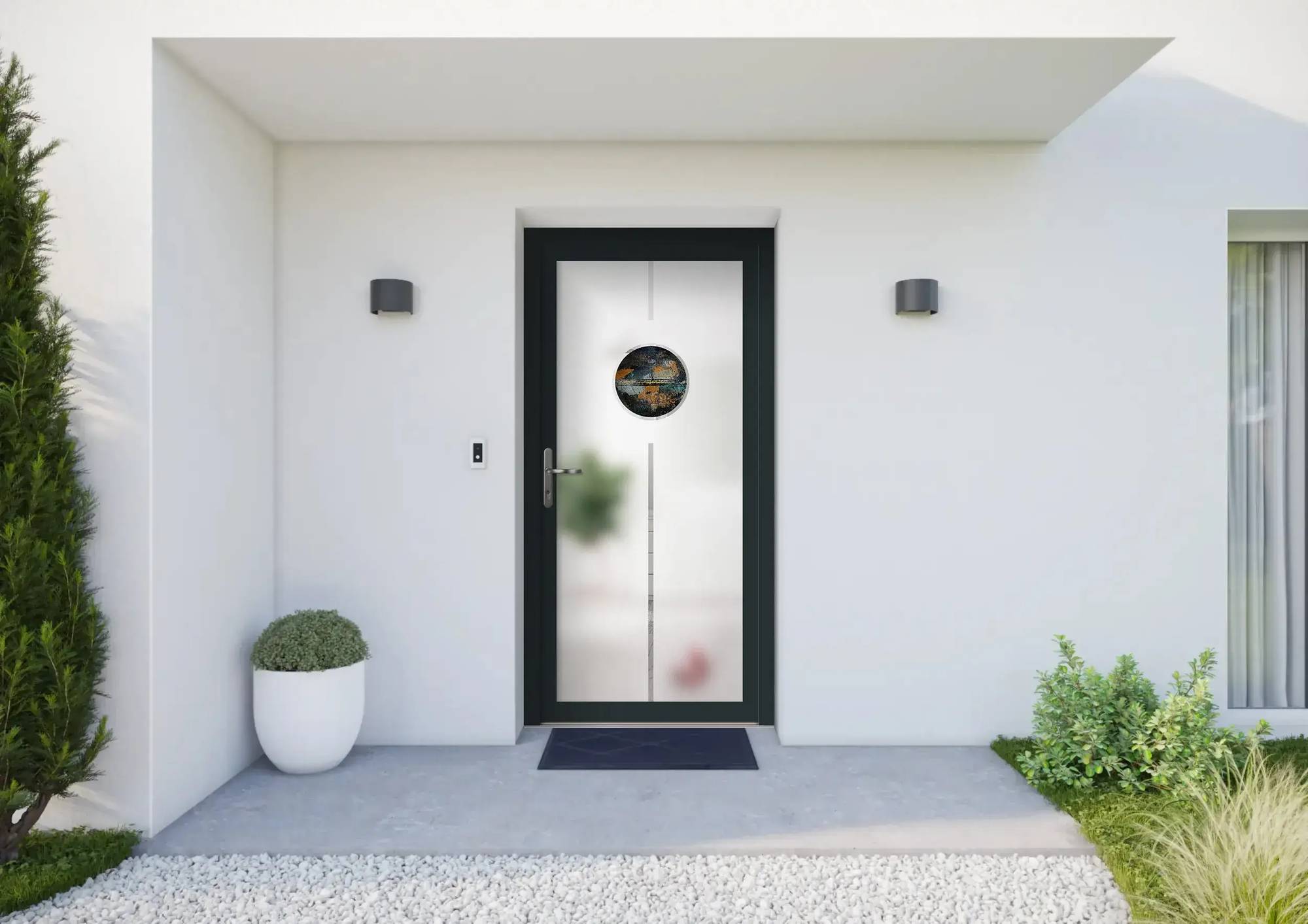 Porte d'entrée blanche avec une vitre ornée de motifs géométriques noirs et marrons, accompagnée d'une applique murale extérieure moderne.