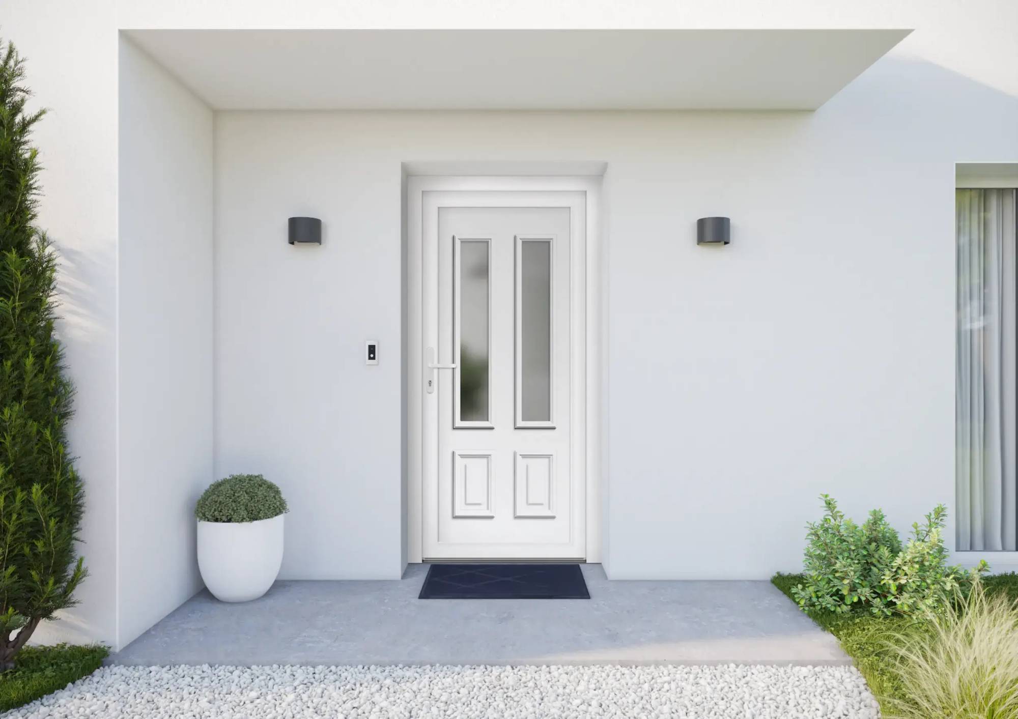 Une porte blanche moderne avec une poignée argentée, un numéro de maison '15' à gauche et une sonnette vidéo à droite.
