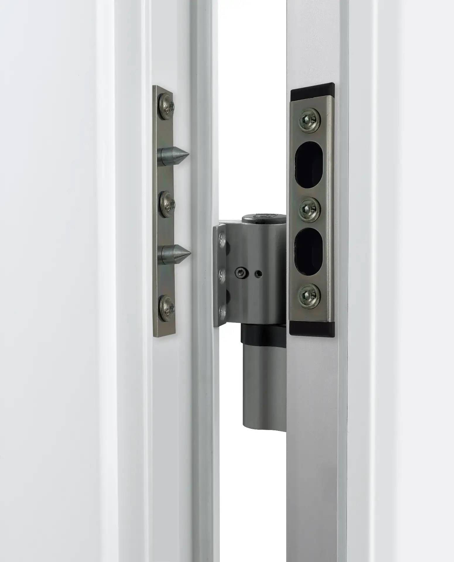 Paumelles à réglage 3D fixées dans les armatures métalliques du dormant et de l'ouvrant pour une résistance et une stabilité accrues.