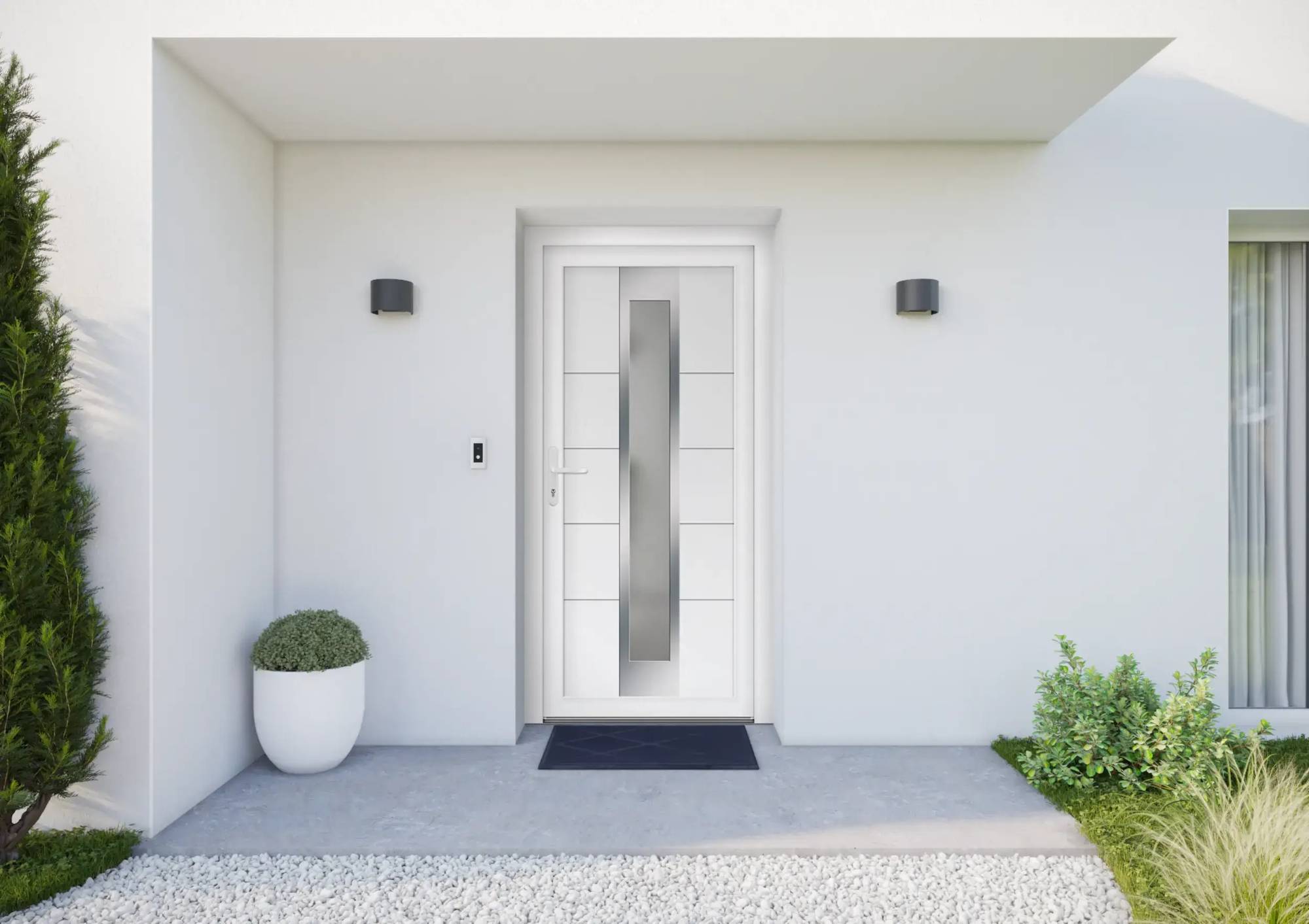 Une porte blanche moderne avec une poignée argentée, un numéro de maison '15' à gauche et une sonnette vidéo à droite.