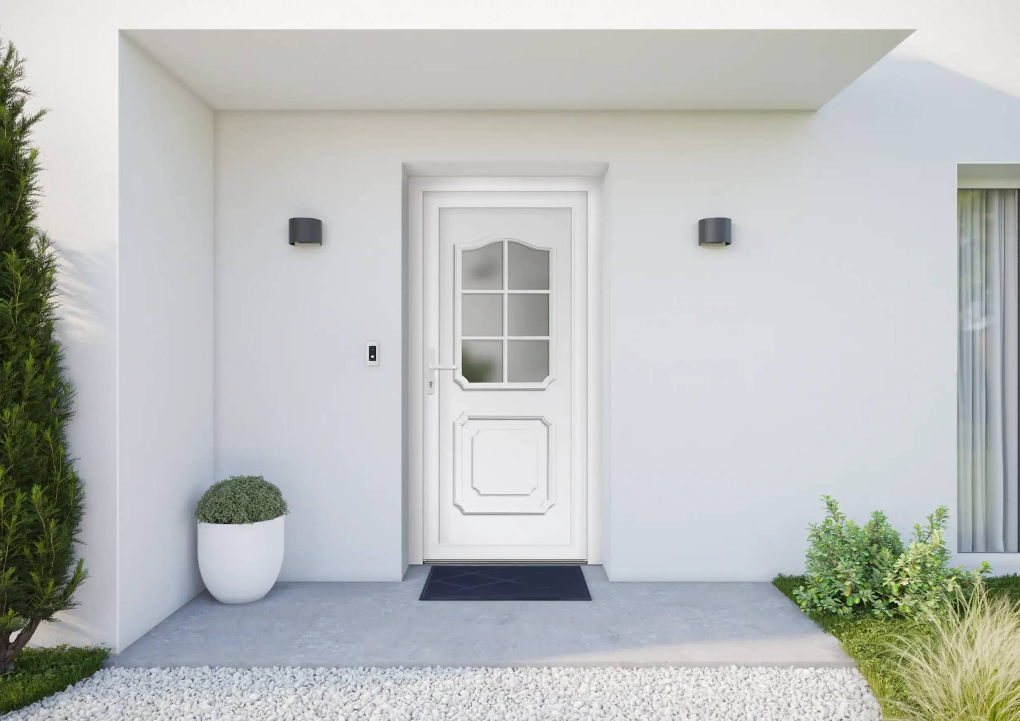 Une porte blanche moderne avec une poignée argentée, un numéro de maison '15' à gauche et une sonnette vidéo à droite.