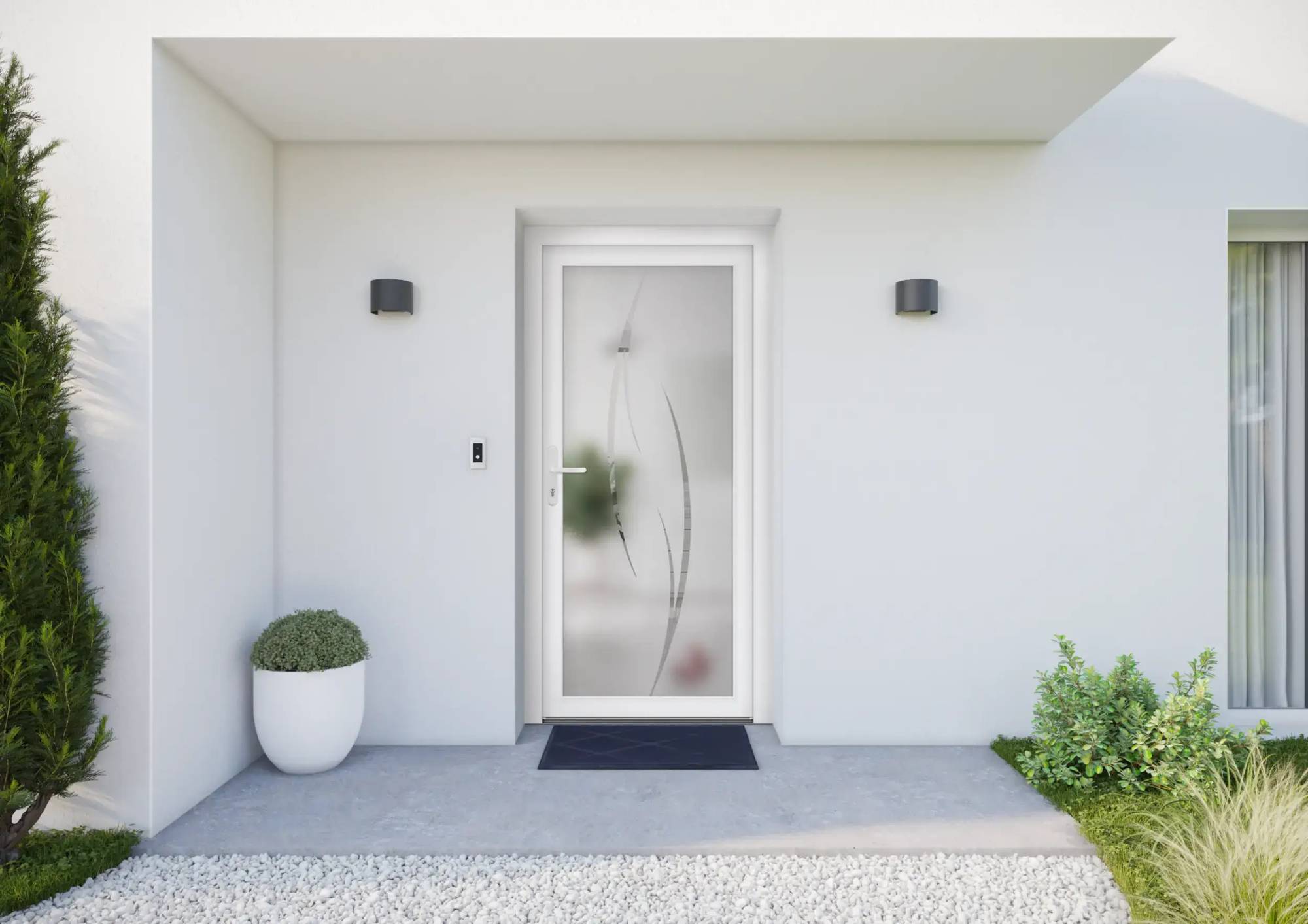 Porte d'entrée moderne blanche avec cinq fenêtres rectangulaires et une plante verte en pot à proximité.