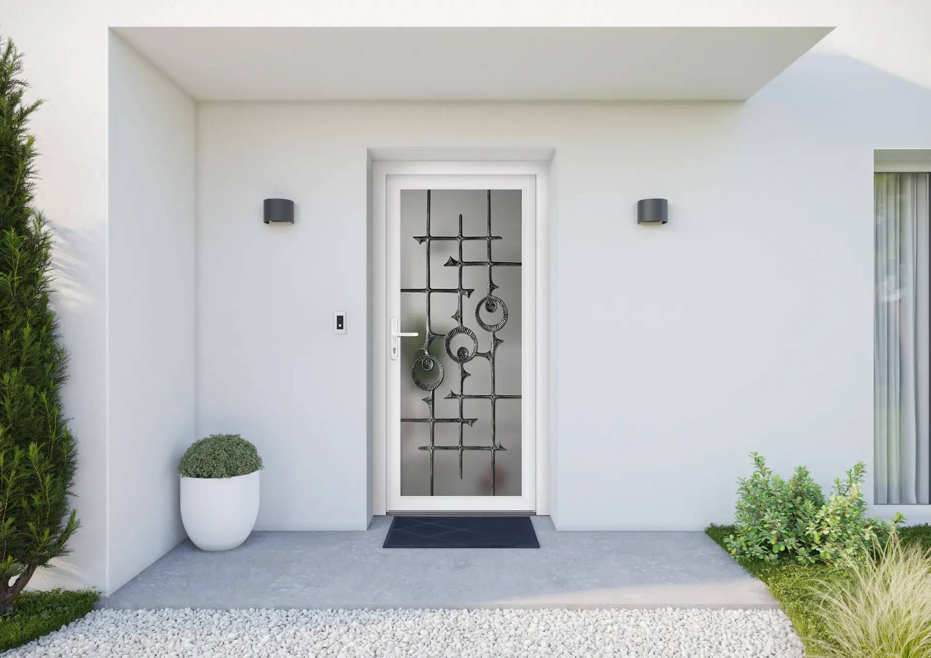 Porte d'entrée moderne blanche avec cinq fenêtres rectangulaires et une plante verte en pot à proximité.